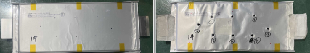 针刺后电芯针刺孔周围形成轻微凹陷,本体保持完整,无鼓胀或破裂,符合“不起火、不爆炸”的行业标准。