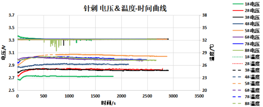 本次测试在温度25℃±2℃,相对湿度15%-90%的环境中进行,电池标准充电后,通过电池挤压针刺试验机(型号:BE-6045-20T 精度±0.5%FS)使用φ5~8㎜的耐高温钢针,于垂直于接片表面方向,以25±5㎜/s的速度刺穿电芯不同位置八次,并将钢针停留在电芯内部。观察30min,持续监测测试前后的电压、内阻和温度变化,并全程录像。