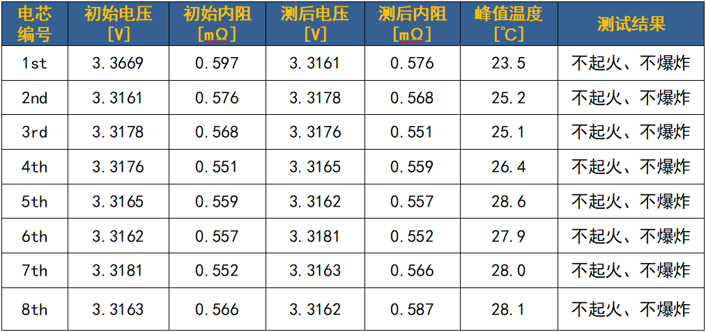 穿刺后30min内电压无变化,电芯表面温度最高不超过30℃,穿刺后电芯内阻无变化;实验后静置24h,电池无复燃或爆炸风险。